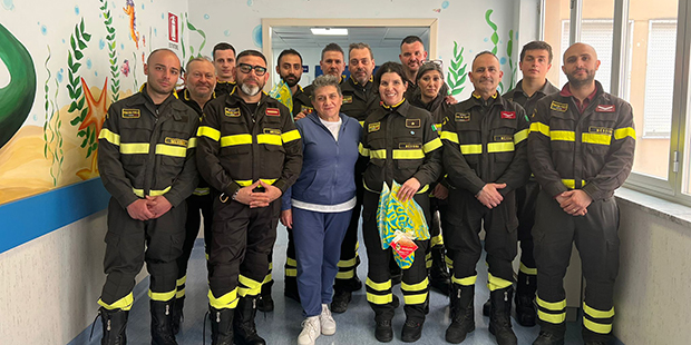 Anche quest’anno i vigili del fuoco volontari del Distaccamento di Antillo, hanno donato “l’uovo del pompiere” ai piccoli pazienti del Centro di Cardiochirurgia pediatrica e del reparto di pediatria dell’ospedale “San Vincenzo” di Taormina. L’iniziativa, giunta alla quarta edizione, è stata organizzata dal capo distaccamento Alberto Trischitta con il presidente dell’Associazione nazionale Vigili del Fuoco volontari-Delegazione di Antillo Santo Triolo. Presenti una delegazione di vigili del fuoco volontari di Antillo e anche del Distaccamento di Mojo Alcantara, oltre il personale dal Comando provinciale di Messina rappresentato dall’ispettore antincendi ing. Gaia Pavone e dai capi squadra Antonio Petrosino e Gianfranco De Salvo. I pompieri sono stati accolti in ospedale dal primario del Ccpm Sasha Agati, dal personale di turno e dai genitori dei piccoli pazienti rappresentati da Caterina Rizzo. «Ci sono gesti che sembrano piccoli, ma che in realtà hanno un valore immenso - hanno commentato i genitori - un grazie di cuore al Comando provinciale dei Vigili del Fuoco di Messina e ai Distaccamenti di Antillo e Mojo Alcantara, che hanno portato un po’ di luce in reparto donando uova di Pasqua e piccoli gadget ai bambini e ai ragazzi ricoverati. In una settimana così speciale, la loro presenza è stata molto più di un dono: è stata vicinanza, calore, umanità. Perché a volte basta davvero poco, una visita, un pensiero, un gesto semplice, per accendere un sorriso sul volto di chi sta vivendo un momento difficile. E quei sorrisi valgono tutto».
